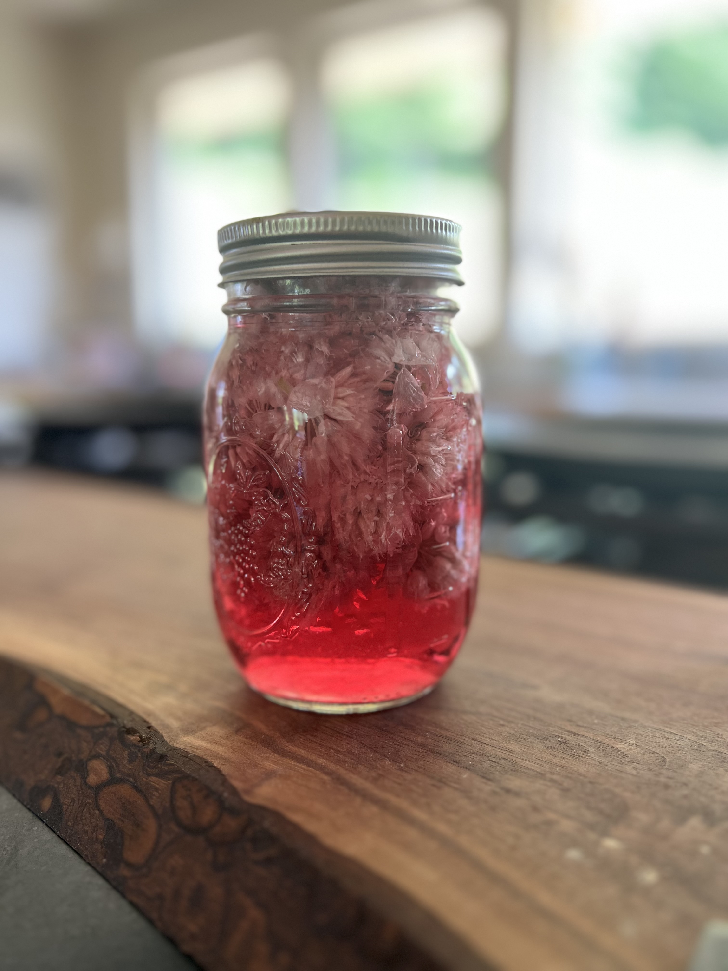 Two weeks ago, I filled a Mason jar with chive blossoms from my garden and added plain white vinegar. I have to admit, the jar looked pretty and I was pleased with myself. It has now turned the most vibrant pink and it tastes fantastic. I’ll be using this amazing concoction in salad dressings and may even toss the pickled blossoms into the mix. If you have chive blossoms, give this a try.